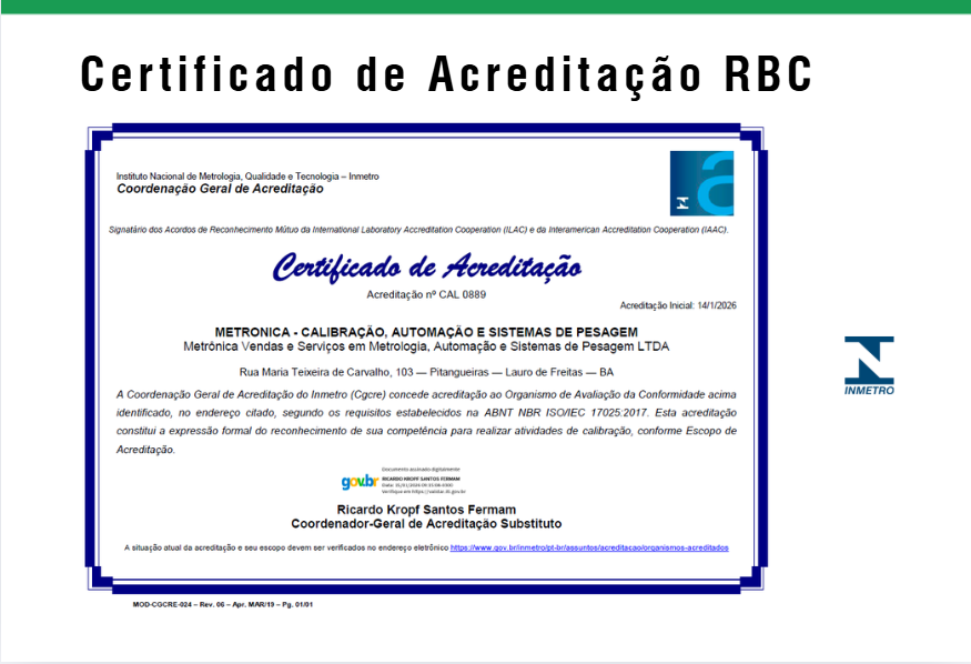 A Metrônica – Calibração, Automação e Sistemas de Pesagem recebeu oficialmente o Certificado de Acreditação RBC (Rede Brasileira de Calibração), concedido pelo Inmetro, por meio da Coordenação Geral de Acreditação (Cgcre).Essa acreditação, baseada na ABNT NBR ISO/IEC...